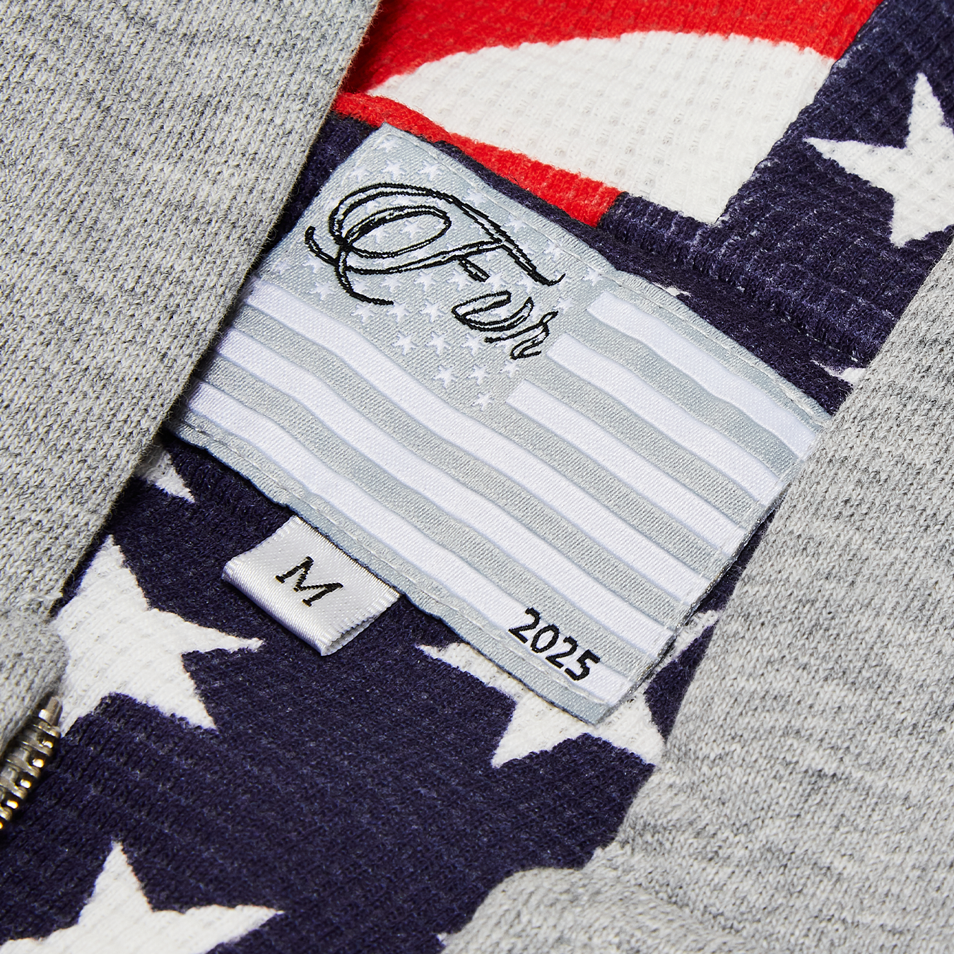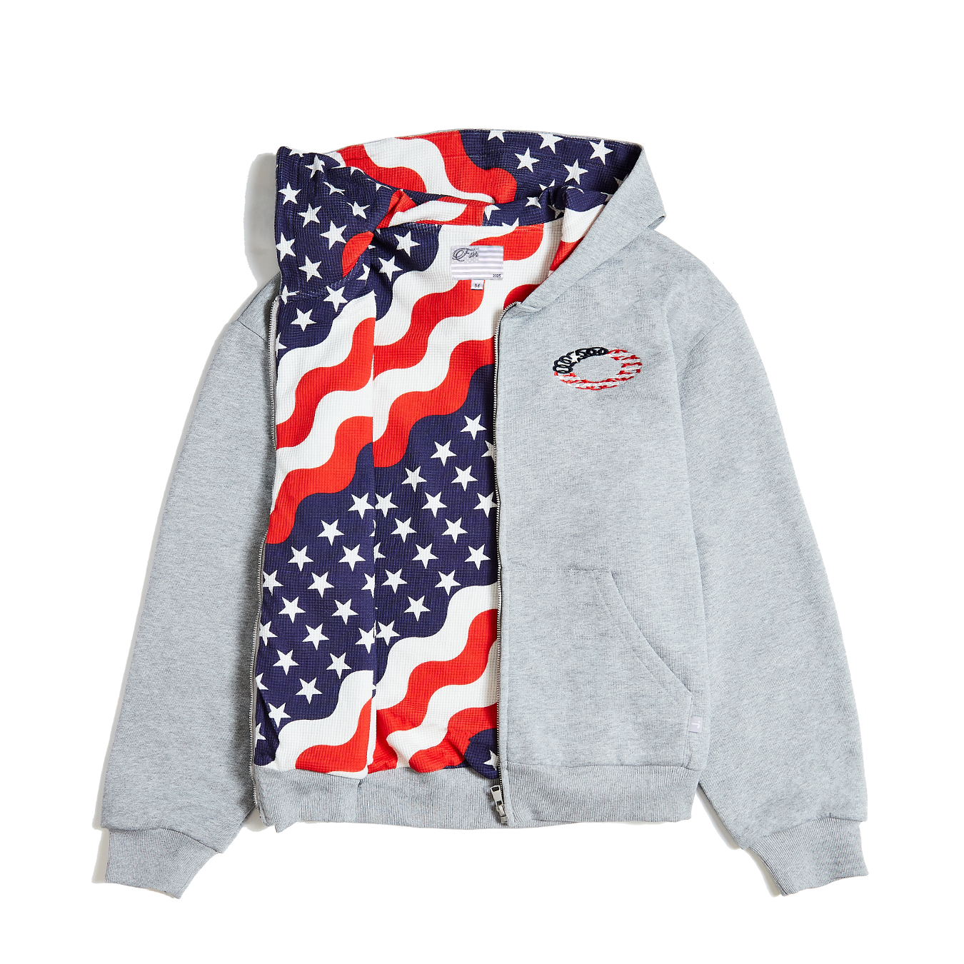 This zip-up hoodie elevates a classic silhouette with thoughtful details and premium construction. Cut and sewn in Los Angeles from heavyweight French terry cotton, it offers a structured yet comfortable feel. The interior reveals a fully lined thermal with a custom American flag print making it a one of a kind piece. Designed with a relaxed, oversized fit, it drapes naturally while maintaining a clean shape. Subtle embroidery on the hood and chest adds a refined signature element