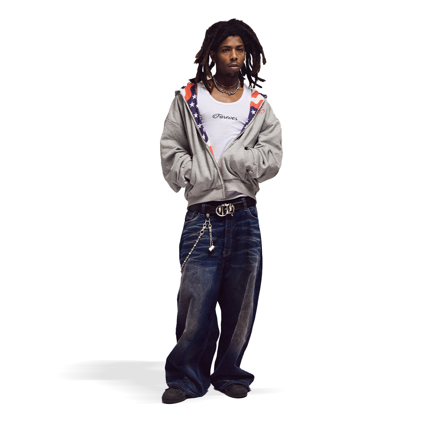 - Relaxed, baggy fit